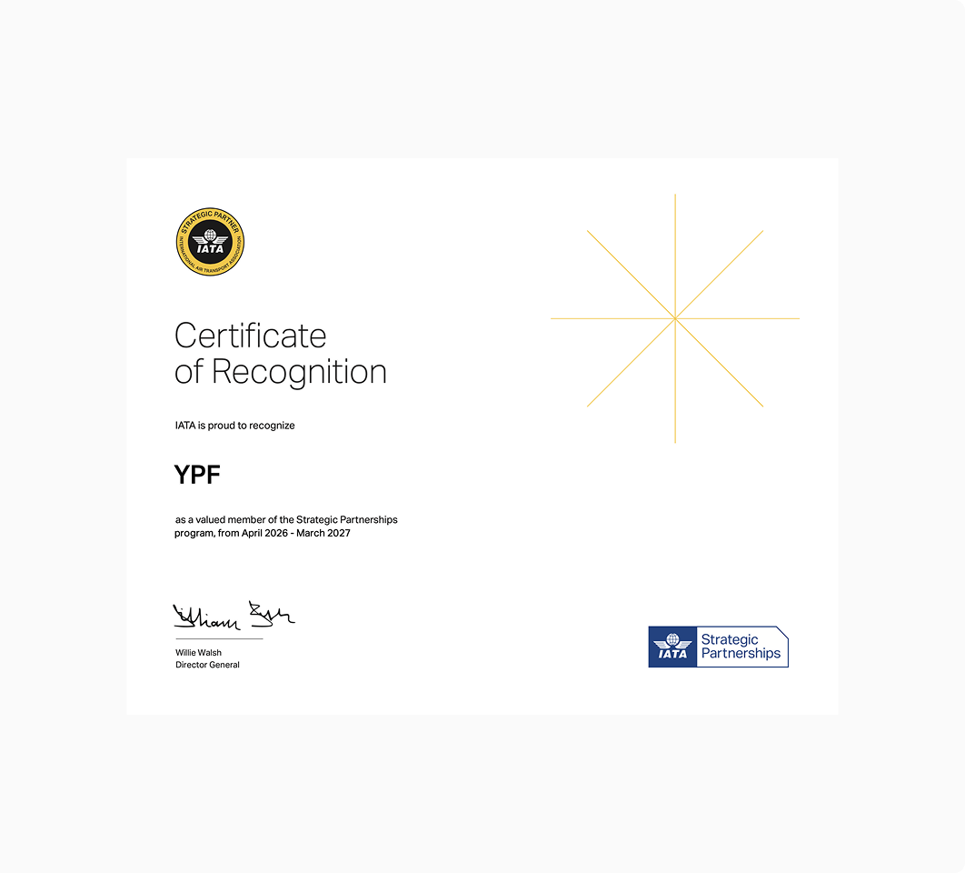 El Certificado 2026 del Programa de Alianzas Estratégicas de IATA (IATA Strategic Partnerships Program Certificate of Recognition), un aval otorgado por la Asociación Internacional de Transporte Aéreo que reconoce a las compañías que cumplen con los más altos estándares de la industria aeronáutica.